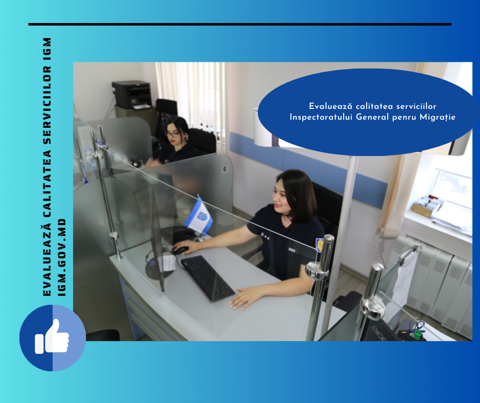 Cu scopul de a oferi servicii publice de calitate beneficiarilor Inspectoratului General pentru Migrație, oferim opțiunea străinilor și cetățenilor Republicii Moldova de a evalua calitatea serviciilor acordate de IGM, precum și modul de deservire și consultanță de către ofițerul Inspectoratului. În acest sens accesați pagina igm.gov.md, găsiți rubrica Informație importantă și atingeți butonul Evaluează calitatea… Continuă lectura Vorbește-ne despre experiența ta la IGM iar noi vom îmbunătăți constant serviciile acordate