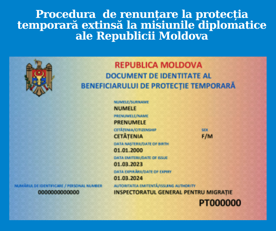 Inspectoratul General pentru Migrație (IGM) informează că, începând cu luna august anului curent, beneficiarii statutului de protecție temporară pot renunța oficial la acest statut, atât la subdiviziunile sale teritoriale, cât și în afara țării, prin intermediul misiunilor diplomatice și oficiilor consulare ale Republicii Moldova. Pentru a renunța la protecția temporară, solicitanții trebuie să depună o… Continuă lectura Procedura de renunțare la protecția temporară extinsă la misiunile diplomatice ale Republicii Moldova
