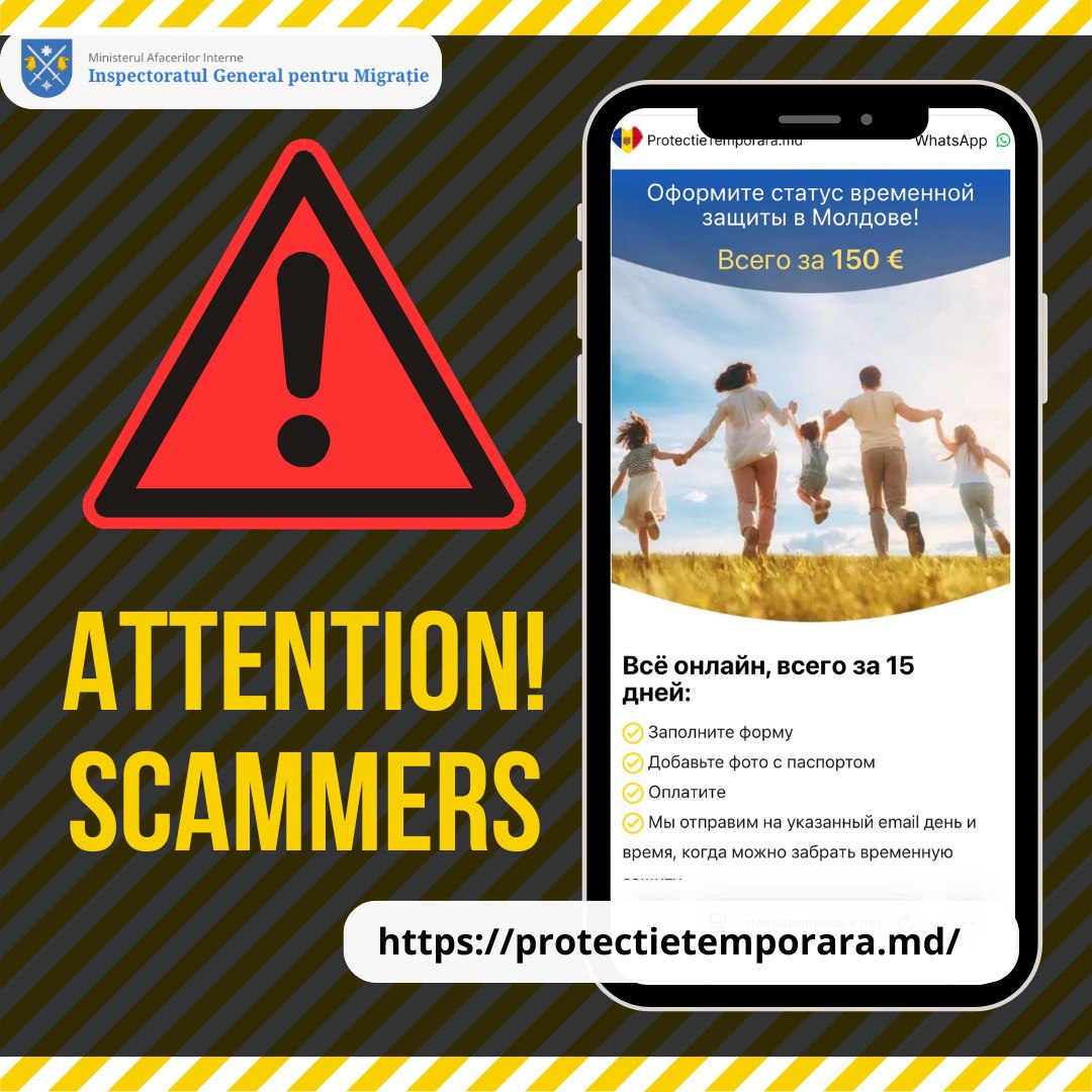 The General Inspectorate for Migration (GIM) informs that it has identified the existence of a fraudulent website – https://protectietemporara.md/ – which claims to provide, for a fee, services for extending temporary protection for displaced persons from Ukraine. Please note that this website is not administered by the General Inspectorate for Migration nor by any public… Continue reading Attention – Fake website targeting displaced persons from Ukraine!