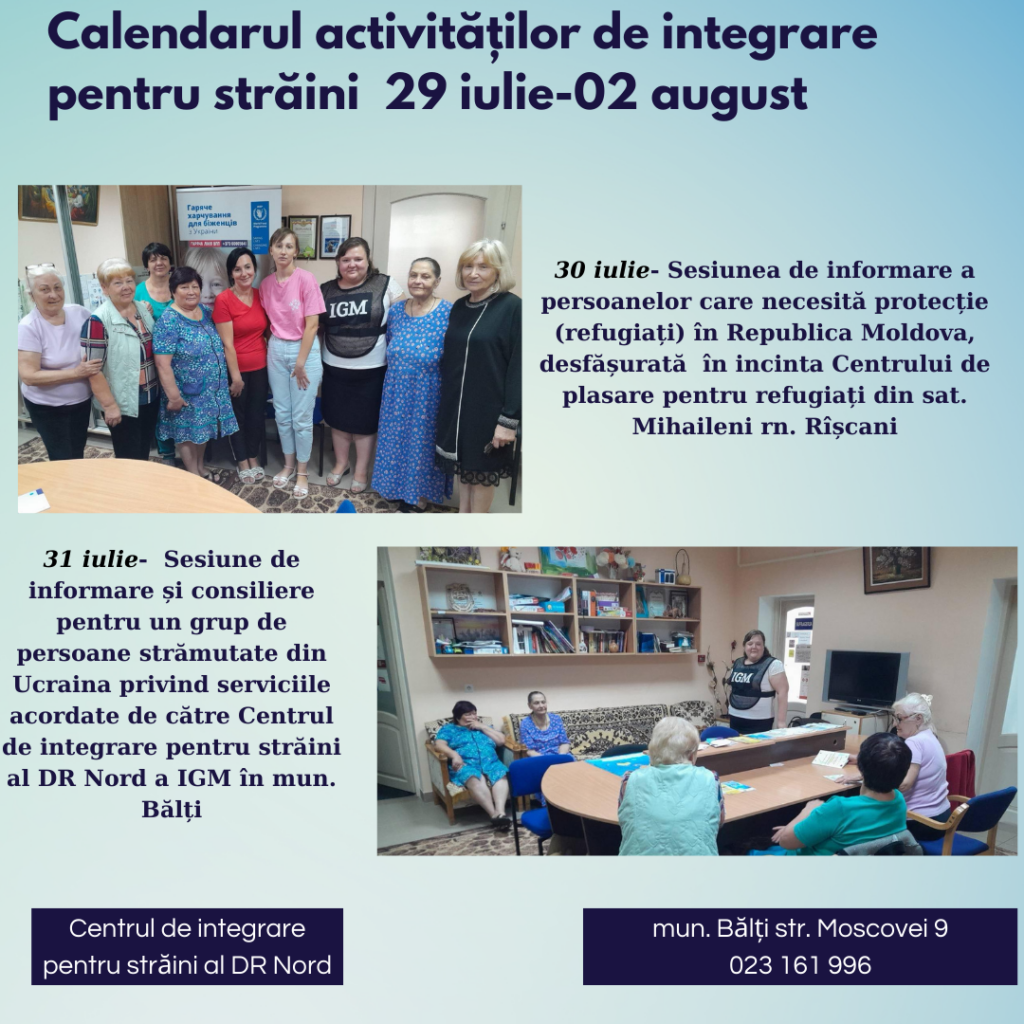 Un grup de persoane strămutate din Ucraina, la 31 iulie, a fost consultat privind serviciile acordate de către Centrul de integrare pentru străini al DR Nord a IGM în mun. Bălți. În urma consultațiilor și nevoile stabilite, străinii au fost incluși în activități  de integrare, învățare a limbii române și în cadrul sesiunilor de acomodare socio-culturală.
