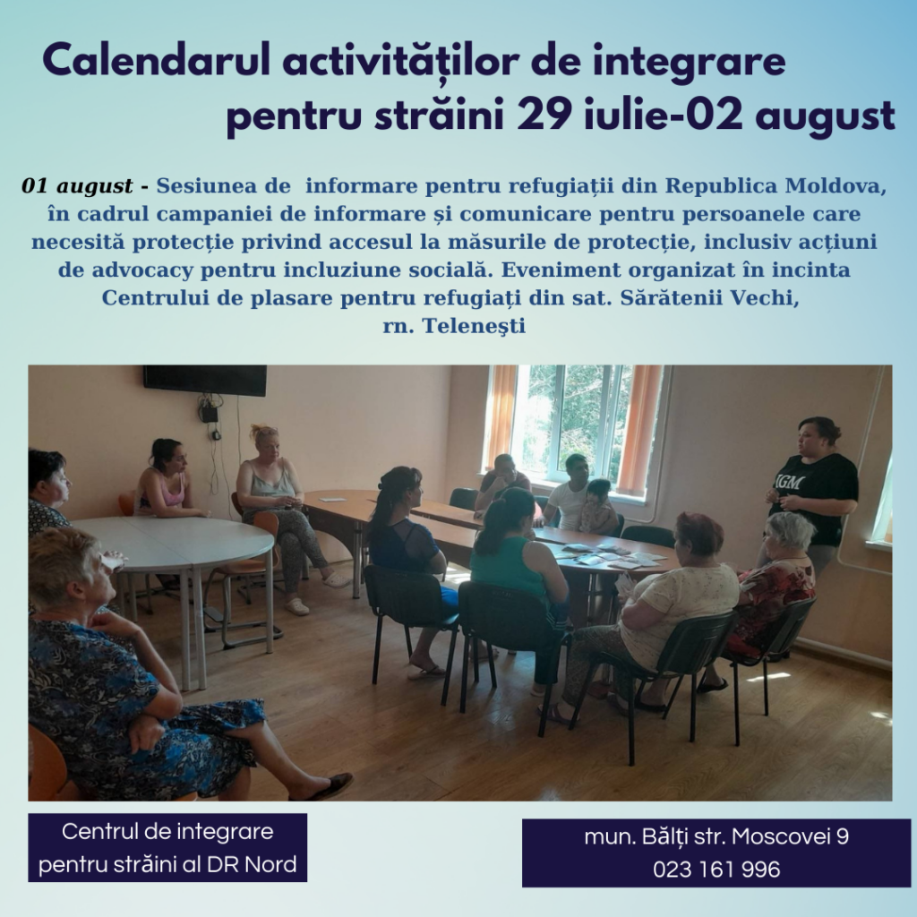 Joi, 01 august a fost organizat un eveniment în incinta Centrului de plasare pentru refugiați din sat. Sărătenii Vechi rn. Teleneşti. Sesiunea de informare pentru refugiații din Republica Moldova a fost organizată în cadrul campaniei de informare și comunicare pentru persoanele care necesită protecție privind accesul la măsurile de protecție, inclusiv, acțiuni de advocacy pentru incluziune socială.