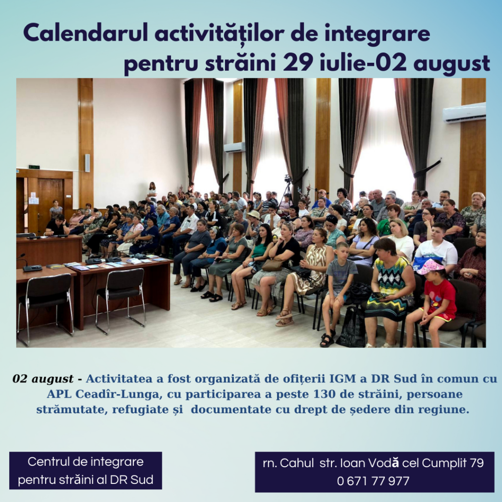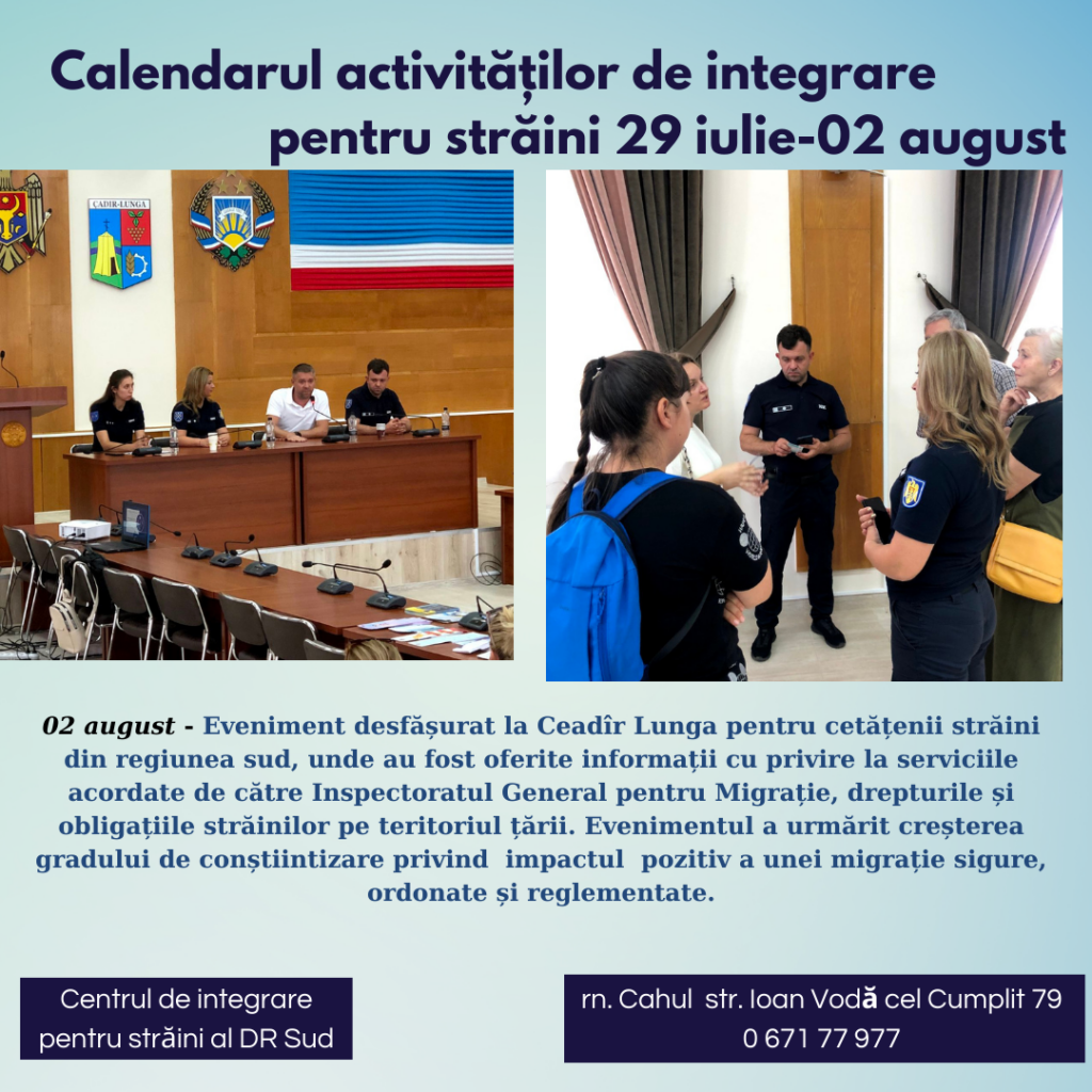 Astăzi, 02 august, a fost organizat de către ofițerii IGM a DR Sud în comun cu administrația  publică locală  din Ceadîr-Lunga, un eveniment cu participarea a peste 130 de străini din regiunea sud. La întrunire s-a discutat despre  serviciile acordate de către Inspectoratul General pentru Migrație, drepturile și obligațiile străinilor pe teritoriul țării. La fel evenimentul a urmărit creșterea gradului de conștientizare privind impactul pozitiv a unei migrație sigure, ordonate și reglementate.