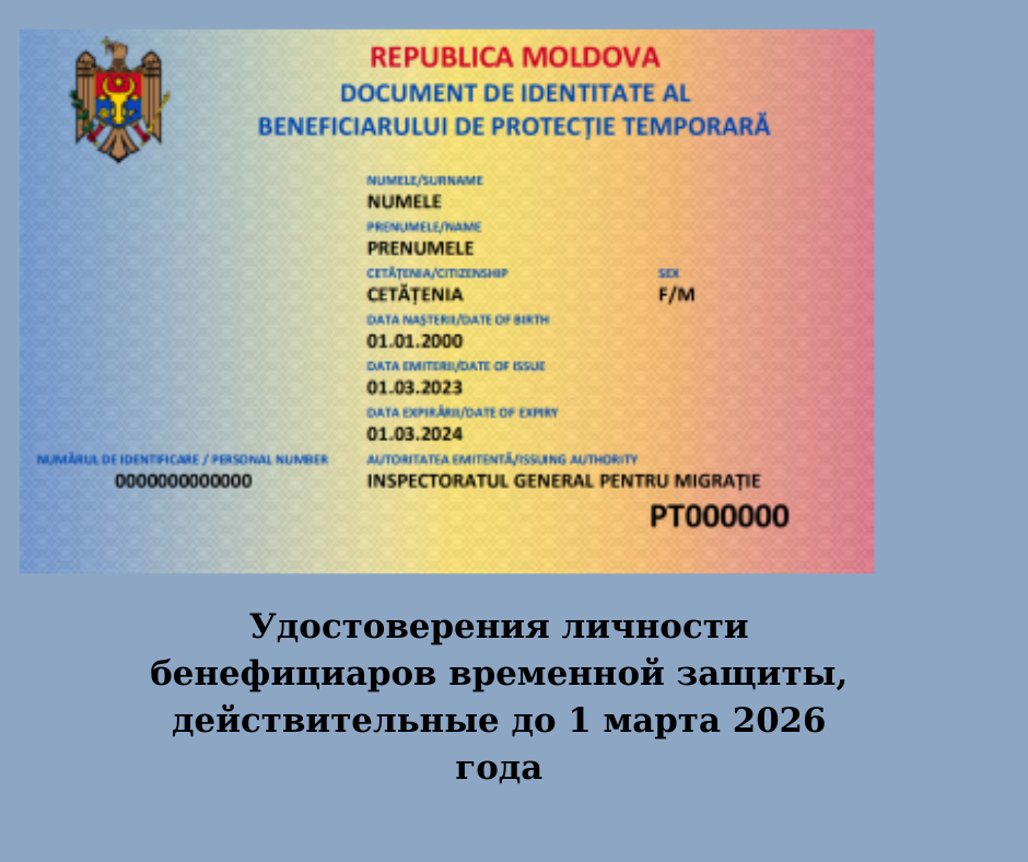 Генеральный Инспекторат по Миграции сообщает, что по состоянию на 1 марта 2023 года Республика Молдова предоставила временную защиту перемещенным лицам из Украины сроком на 1 год. Согласно Постановлению Правительства № 21/2023 о предоставлении временной защиты перемещенным лицам из Украины, статус бенефициара временной защиты подтверждается документом, удостоверяющим личность, выданному лицу. Уточняем, что Постановлением Правительства № 93… Читать далее Удостоверения личности бенефициаров временной защиты, действительные до 1 марта 2026 года
