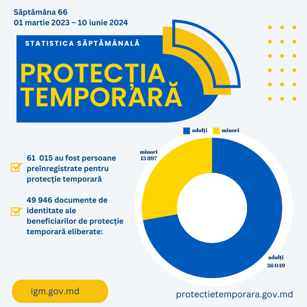 Inspectoratul General pentru Migrație prezintă statistica actualizată săptămânal privind documentarea cetățenilor Ucrainei pe teritoriul Republicii Moldova: protecția temporară, sistemul de azil, permise de ședere și dobândirea cetățenia Republicii Moldova.